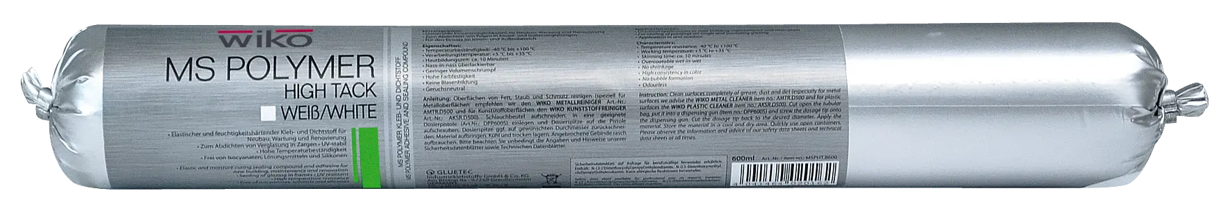 WIKO® MS POLYMER HIGH TACK is an extremely strong construction and assembly adhesive for universal use in industry and trade. It is a high-quality, 1-component, elastic MS polymer-based adhesive with very high wet holding and adhesive strength for heavy-duty bonding.