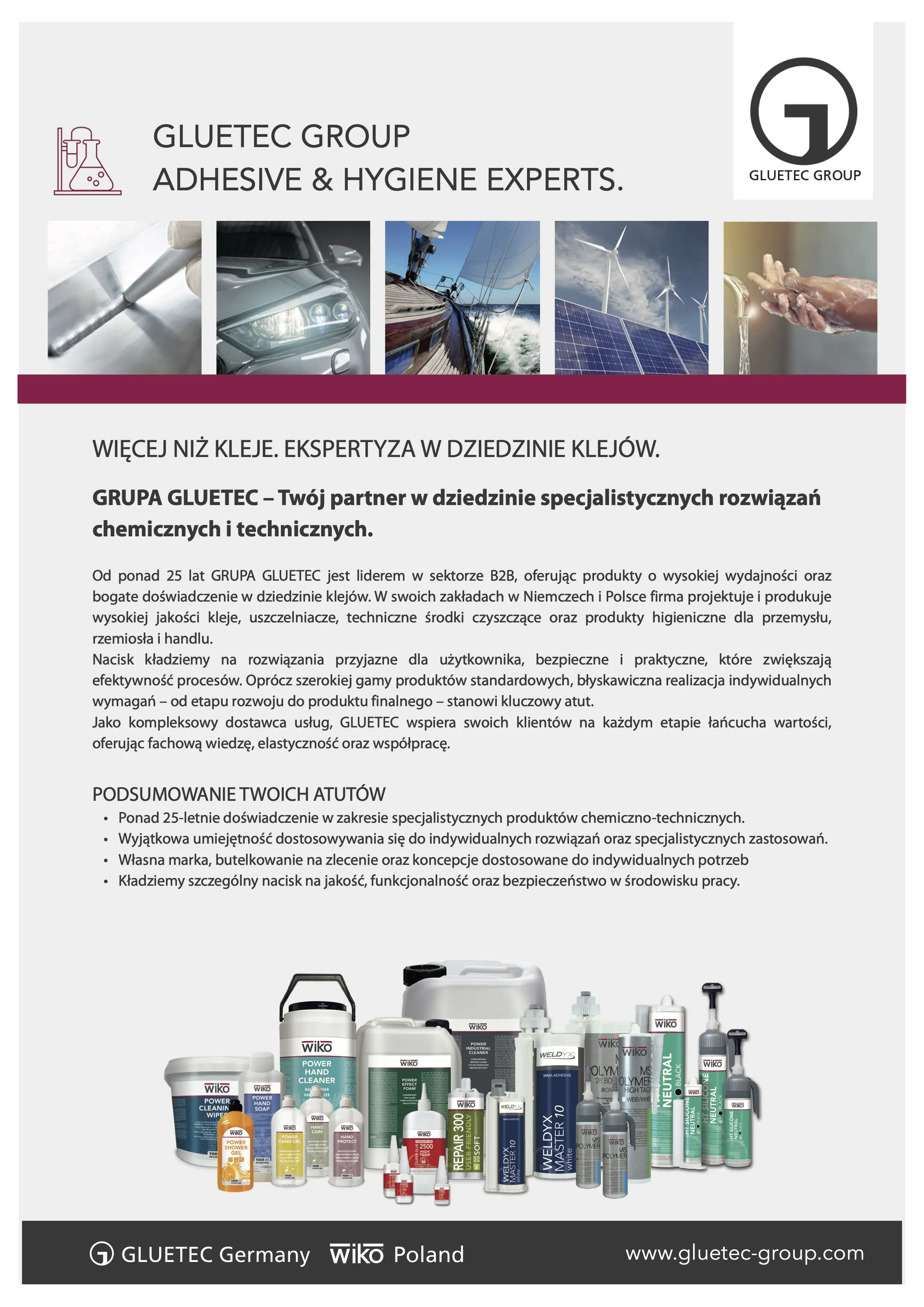 Odkryj świat marek GLUETEC. Bardzo wydajne kleje, uszczelniacze, aerozole i inne produkty marek WELDYX®, WIKO®, LABU® i BLOCK BOND®!